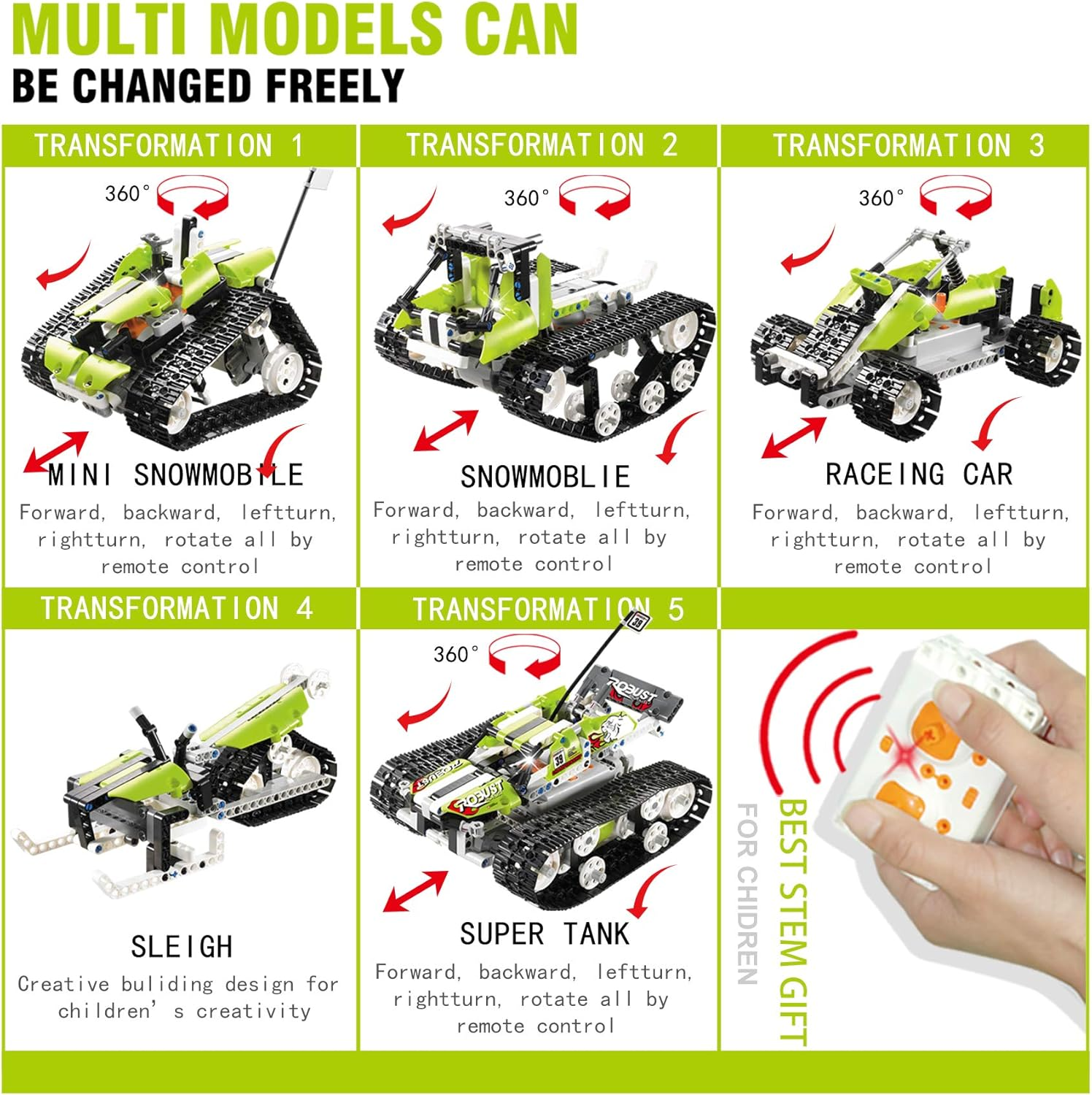- 5 different builds: RC car, robot, crane, forklift, tank