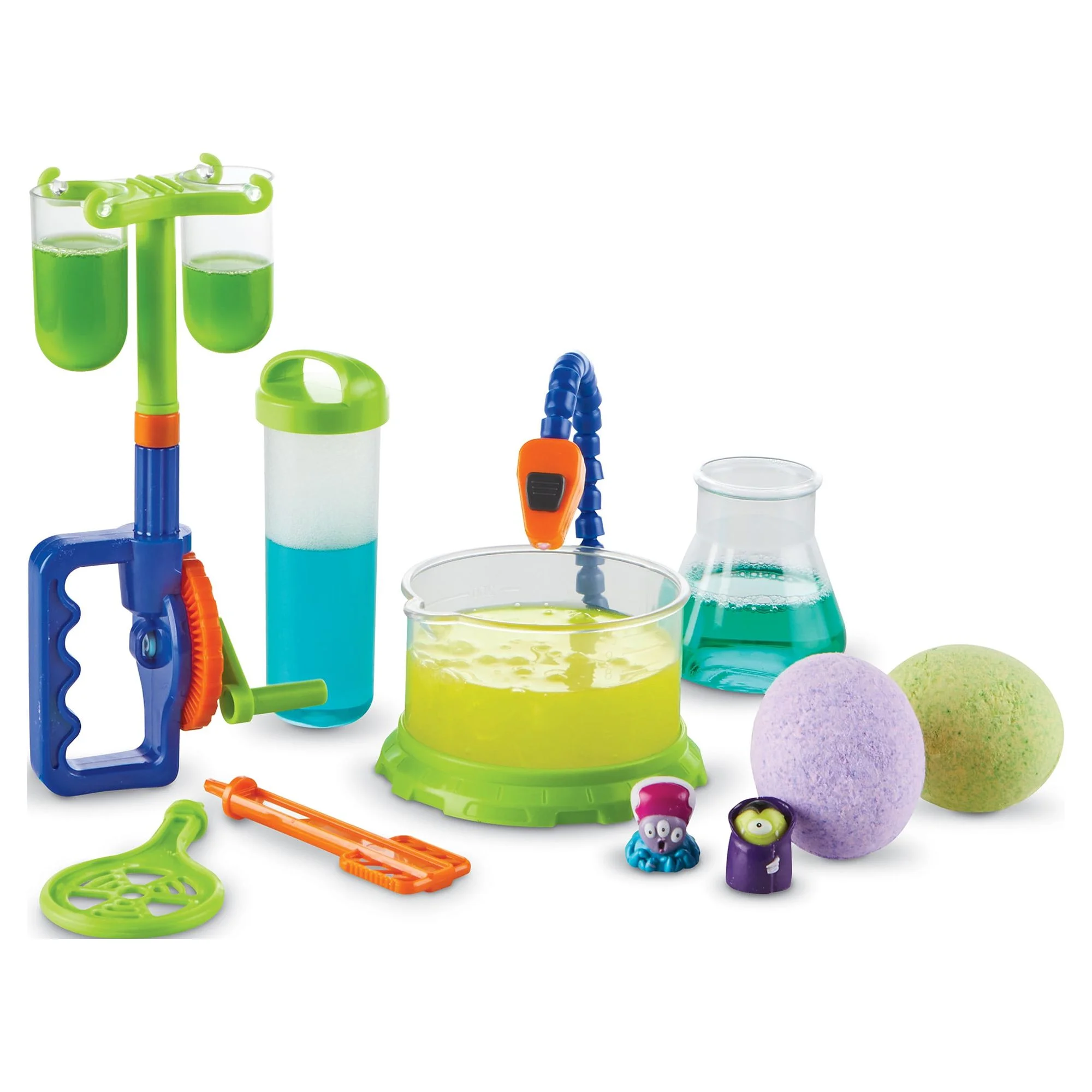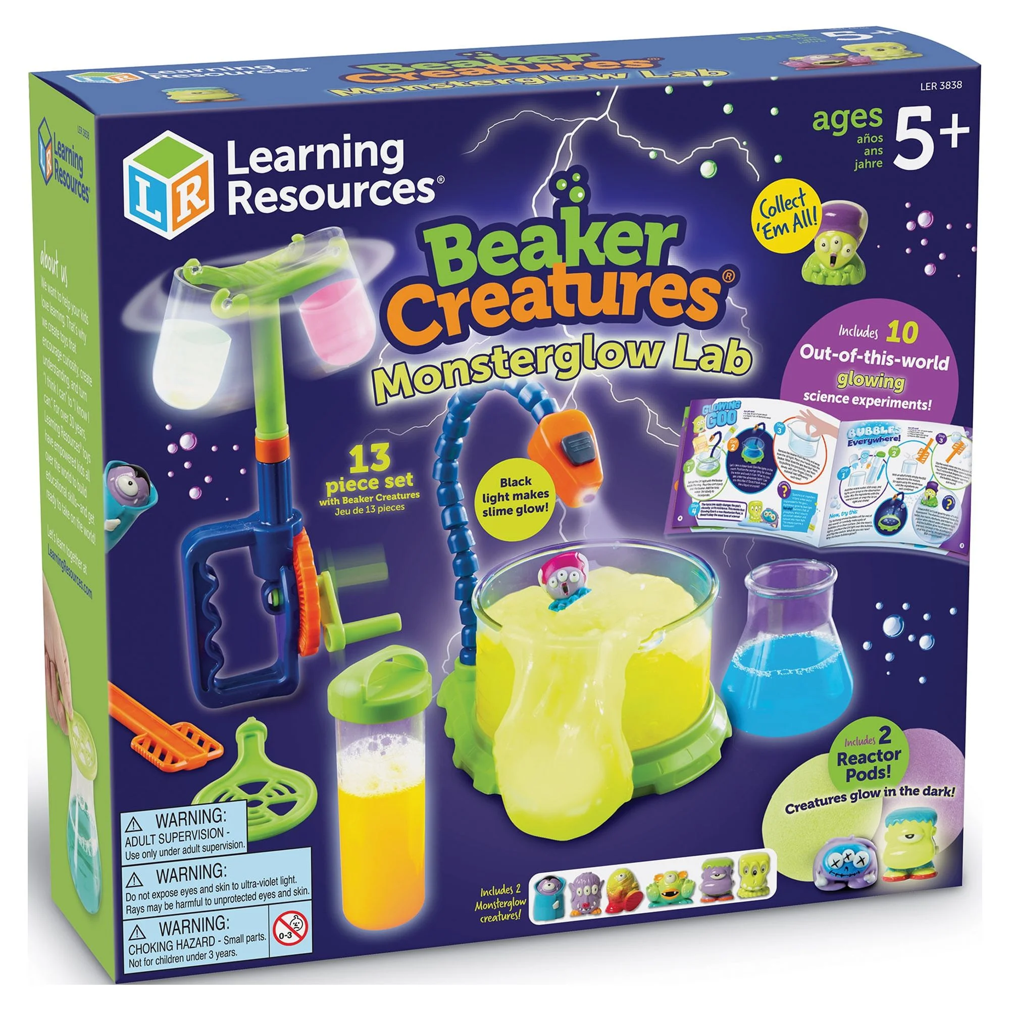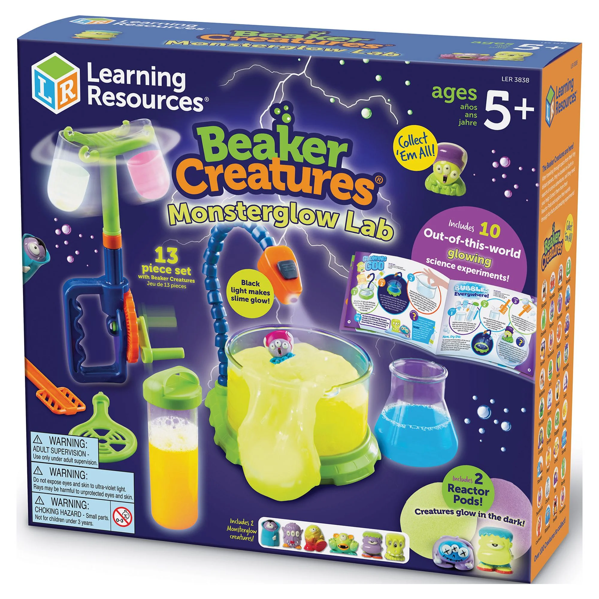 Are you ready to make new glowing, ghoulish science discoveries? Uncover the secrets and science behind the glow with the Beaker Creatures Monsterglow Lab from Learning Resources. This real working kids' experiment lab set helps your little creatures scientists build fun STEM skills with experiments inspired by biology, chemistry, and astronomy! Explore the 20-page full-color experiment booklet to learn facts about bioluminescence, make your own glowing slime and cobwebs, and more! There are more than 20 spooky experiments to master! The Beaker Creatures Monsterglow Lab includes exclusive creature lab components - spin up your glowing creations with the twisting, twirling centrifuge, or activate your black light blaster to trigger a glowing reaction.