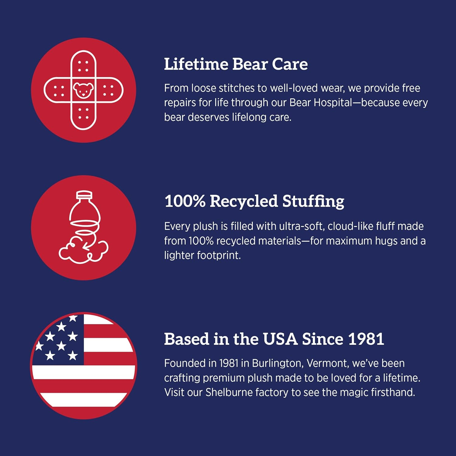 Lifetime Guarantee - The second your Bear arrives it's guaranteed for life, meaning any damage can be mended at the Bear hospital in Vermont; If it can't, a new Bear will be sent along with condolences-and a new lifetime guarantee