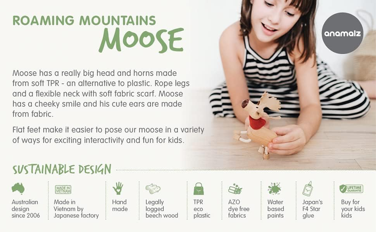 Interactive Baby and Preschool Toys – This free-standing moose toy is made with natural wood and features posable legs and neck that kids will love to bend and twist. Play, learn, and have fun at home and school!