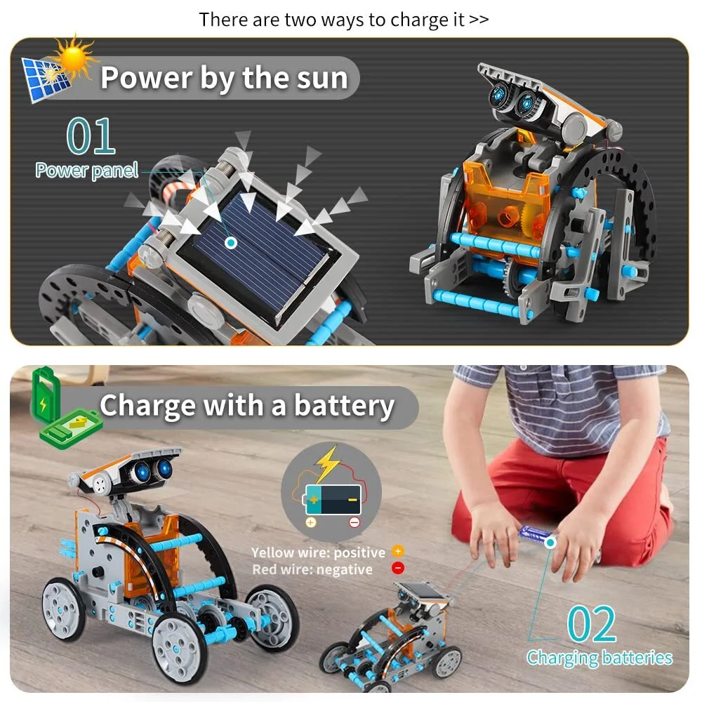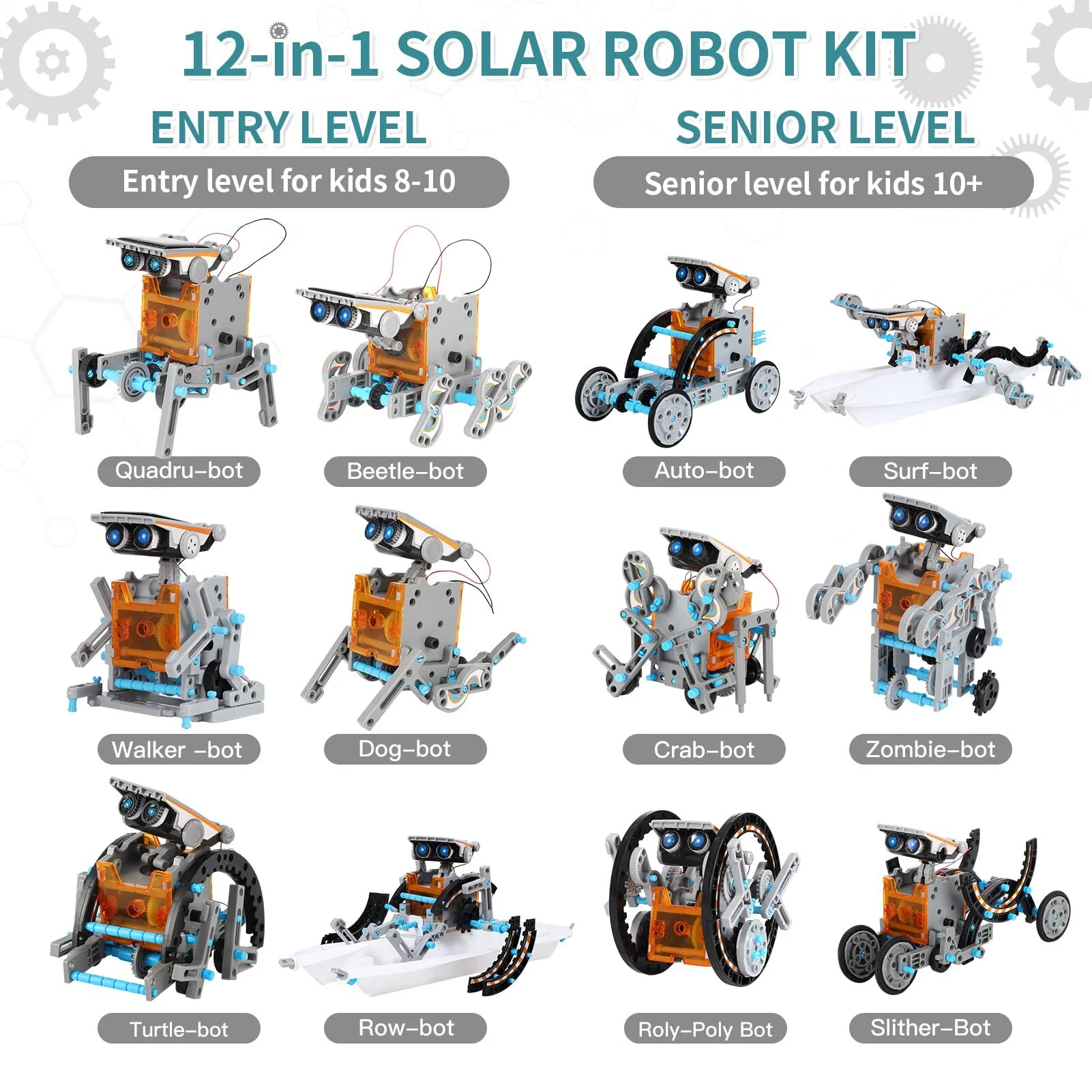 This incredible 12-in-1 robotics kit teaches renewable energy, engineering, and creativity. Kids build 12 different solar-powered robots—from dinosaurs to cars to boats!