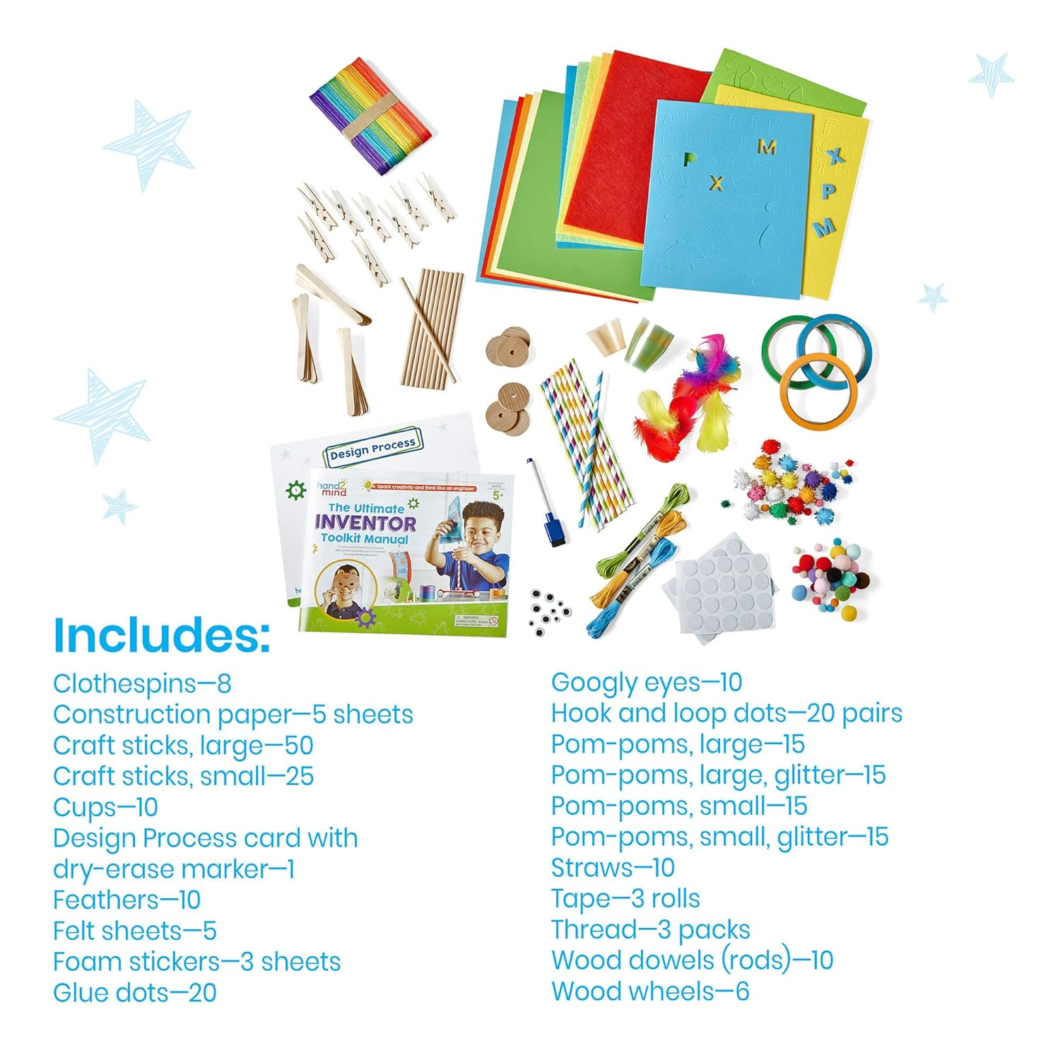 Our age-appropriate Ultimate Inventor Toolkits encourage children to explore a wide variety of engineering concepts and solve real-world problems. The teacher-developed project guide and extensive supply of building materials provide hours of open-ended exploration. The reusable storage box can also be used to store a child's creations. For over 50 years, hand2mind has encouraged hands-on learning and discovery, driving deeper understanding and helping children unlock their full potential. hand2mind specializes in science kits and stem toys designed to help students learn by doing. Our offering of stem kits range from chemistry sets to rocket science kits to earth science sets and much more. From early math to middle school math, hand2mind has you covered with products designed to enhance learning in the classroom and the world around us. Through hands-on exploration and discovery we strive to find new ways to encourage students in math practice, literacy activities, STEM education and more!